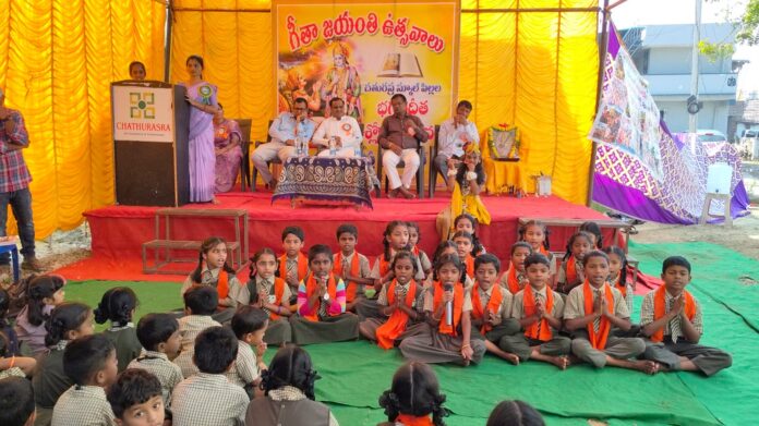 Mortad, December 01 (Gatla News): Children impressed by singing the verses of Srimad Bhagavad Gita with devotion and ecstasy. Gita Jayanti was celebrated on Monday at Chaturasra School in Mortad. Social service worker and Bharat Seva Ratna awardee Patwari Tulasi Kumar attended the Gita Jayanti program presided over by school correspondent Sirashinahal Nambulagiri as the chief guest and explained the importance of Bhagavad Gita. Gita Jayanti is celebrated grandly under the auspices of Chaturasra School every year. All the children were congratulated as the students sang the Gita verses in antyakshari in the program organized in the school. They sang the verses in the respective chapters with devotion. Speaking on this occasion, Tulsi Kumar said that children should be taught the verses of the Gita from childhood so that everyone can know the greatness of our country. He said that the Supreme God Himself taught the Bhagavad Gita to Arjuna and gave it to us, and by making good use of it, we can develop self-knowledge. He urged everyone to follow the Bhagavad Gita every day. He said that the Gita provides solutions to many problems faced in life. The dance performance by the children on the verses of the Gita impressed everyone. Nagesh Patron, President of the Budget School Mortad Mandal, Damodar Vineet Kumar, and teachers participated in this program.
