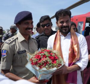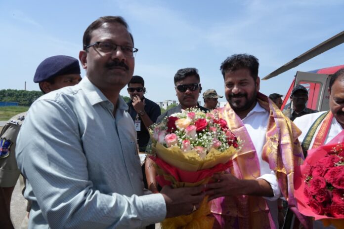 Nizamabad, October 10 (Gatla News):The CM, who arrived in Nizamabad by helicopter at 1 pm to participate in the 12th day of the Dwadash Dinakarma program of Rural MLA Bhupathi Reddy’s mother, organized in the Nizamabad district center, was welcomed by Collector T. Vinay Krishna Reddy, Police Commissioner P. Sai Chaitanya and other district officials at the helipad of the Integrated District Offices Complex.