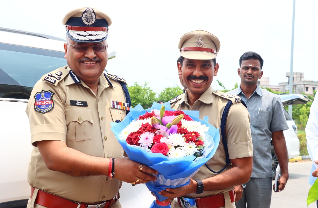 NewsTelanganaNizamabad District Police Commissioner meets State DGP By Suresh - May 29, 2025 0 37 FacebookTwitterWhatsAppLinkedinPinterestEmailPrintTelegram Nizamabad, May 29 (Gatla News): During the visit of Telangana State DGP Dr. Jitender to Kamareddy District Police Office on Thursday, Nizamabad Police Commissioner P. Sai Chaitanya met him with a bouquet of flowers and paid him a courtesy call.
