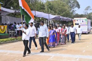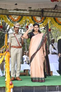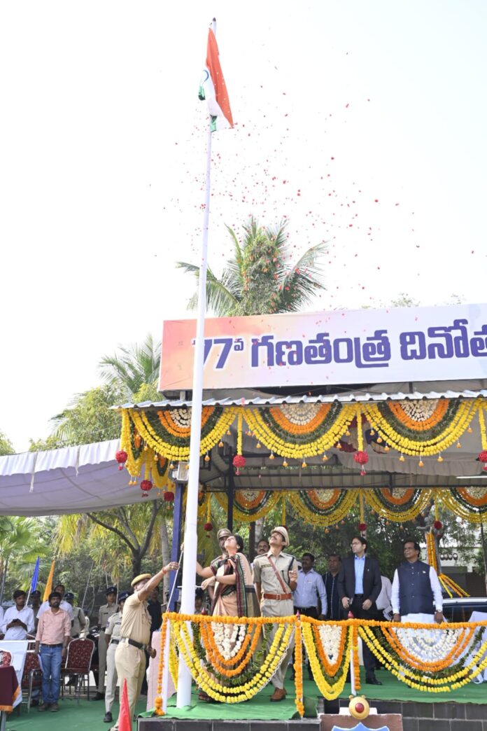 District Collector Ila Tripathi attended as the chief guest and hoisted the tricolor flag. She then received a guard of honor from the police. In her address, she spoke about the welfare and development programs being implemented in the district by various departments and the progress achieved. Urban MLA Dhanpal Suryanarayana Gupta, Police Commissioner Sai Chaitanya, Additional Collectors Ankit and Kiran Kumar, Additional DCP Baswareddy, and district officials from various departments participated in the event. On this occasion, the Collector extended Republic Day greetings to the district officials and prominent citizens. Certificates of appreciation were presented to employees who rendered outstanding services. Stalls set up by the departments of Agriculture, Horticulture, District Rural Development Agency, Forest, Dairy, Veterinary, Education, Health, Women and Child Welfare, Irrigation, Mission Bhagiratha, Fisheries, and others were impressive. The parade showcasing the implementation of the government’s prestigious schemes such as Rythu Bharosa, Indiramma Houses, Food Security (ration) cards, Indiramma Atmiya Bharosa, and other welfare schemes and development programs, along with displays of vehicles related to agriculture, housing, DRDA, Transco, civil supplies, medical and health services, Rajiv Aarogyasri, 108 and 102 ambulances, mobile forensic vans, and HIV/AIDS awareness, was impressive.