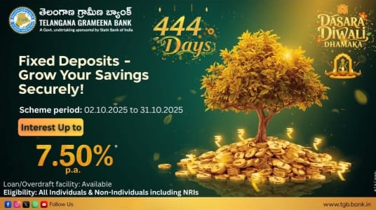Morthad, October 09 (Gatla News): In a statement, Manager Vanitha said that on the occasion of Diwali, Telangana Grameena Bank in Mortad mandal center will give an interest rate of 7.50% per annum on deposits. The scheme will be valid till 31st of this month. She urged people to grow their savings safely and NRIs to take advantage of it. She said that our bank has a loan overdraft facility. She asked them to contact us for complete details during bank hours.