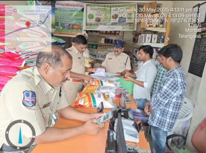 Mortad, May 30 (Gatla News): Mandal Agriculture Officer Harish and SI V Krama inspected several fertilizer shops in Mortad mandal center on Friday under the auspices of the Agriculture and Police Department. The stock registers related to seeds were examined. A stock board related to seeds should be established, and if fake seeds are sold to farmers, criminal cases will be registered and the shops will be seized. It was suggested that bills related to sales should be given without fail. The registers related to all licenses should be maintained as per the Mandal Agriculture Officer’s instructions and loose seeds should not be sold under any circumstances. It was suggested that the stock received from time to time should be entered in the stock register and all licenses should be displayed in a visible manner. Mandal Agriculture Officer Harish Kumar, SP Vikram, Constables Posetti, Narsing Rao, Tirupati, Fertilizer Dealers Srinivas, Devaraj, Mallesh, Srinivas Reddy, Mohan, and Sunil participated in the program.