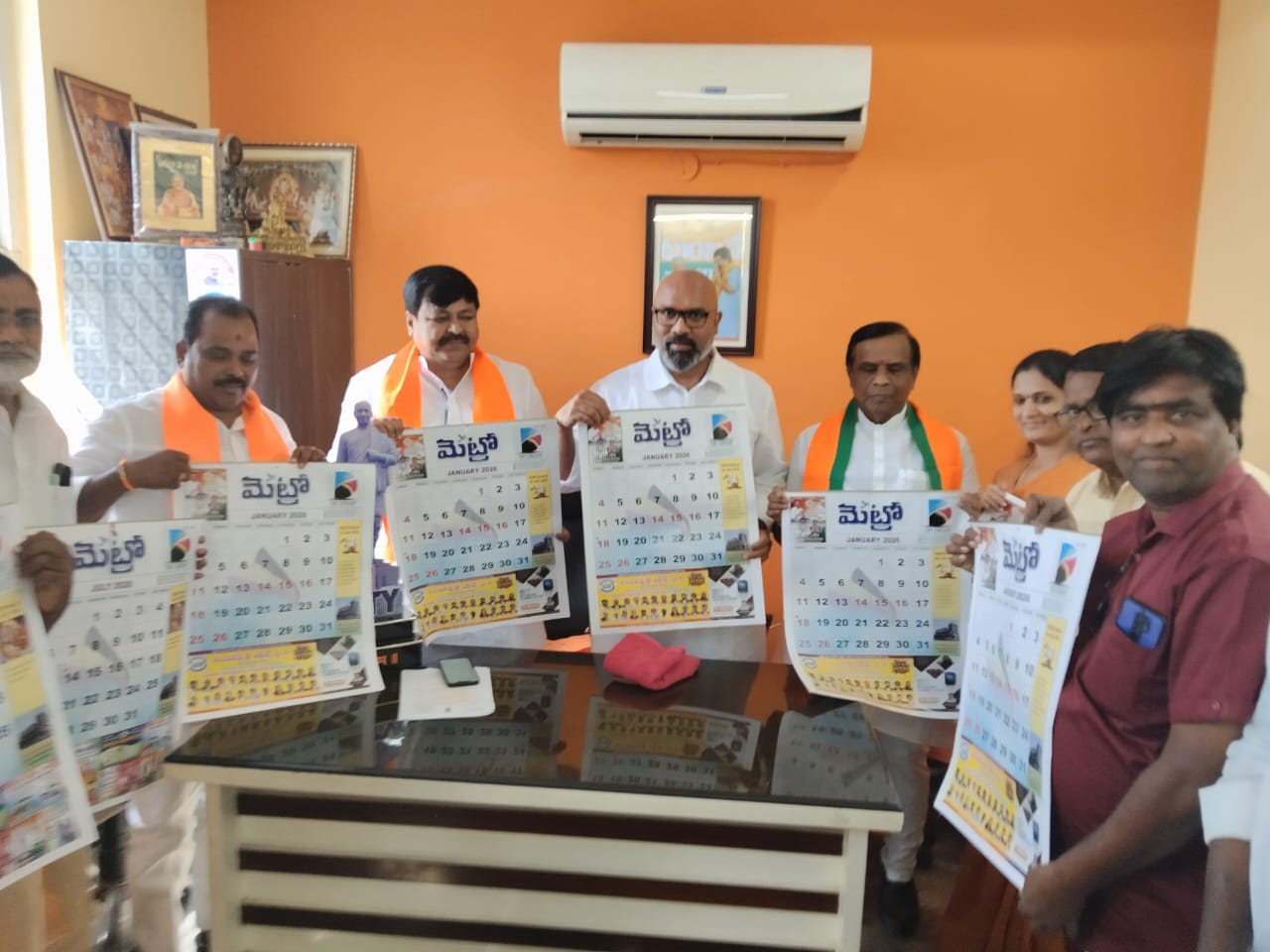 Nizamabad, January 09 (Gatla News): On Friday, Member of Parliament Arvind Dharmapuri and Nizamabad City MLA Dhanpal Suryanarayana unveiled the Metro daily newspaper calendar at the BJP district office in Nizamabad. Speaking on the occasion, the MP said that Metro daily publishes news that reveals the truth, and in the current competitive media landscape, Metro daily is winning the trust and admiration of the people. City MLA Dhanpal Suryanarayana congratulated the Metro daily district team for bringing out a beautiful, colorful calendar. District BJP President Dinesh Kulachari, Sravanthi Reddy, District newspaper representative Gatla Suresh, reporter Mallepula Naveen, and others participated in the program.