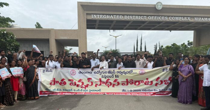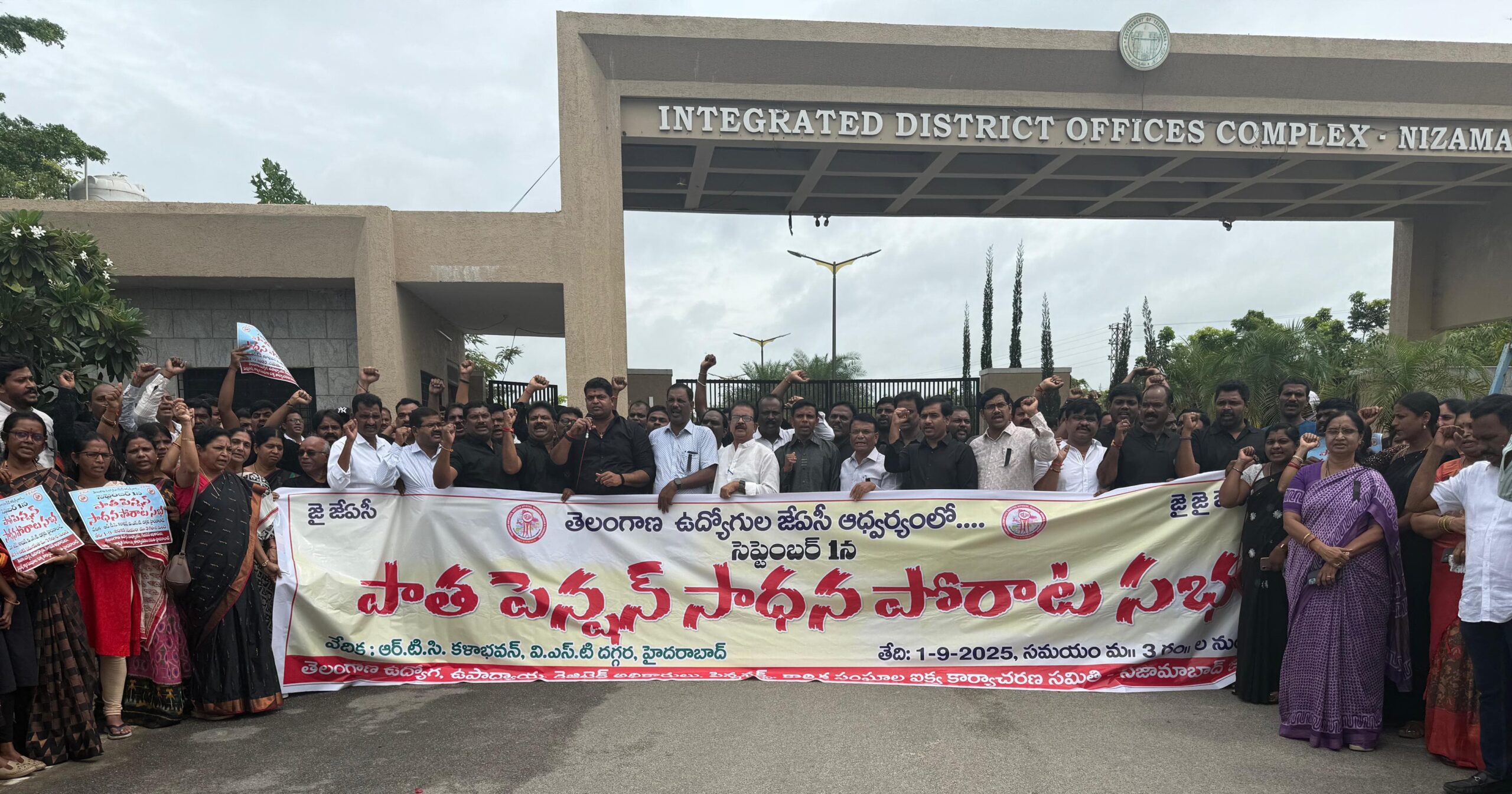 As per the orders of the TGJAC State Committee, Employees JAC District Chairman and TNGO District President Nasetti Suman Kumar held a protest in front of the Nizamabad District Collectorate office to observe Pension Rebellion Day and demand the end of the CPS ghost. Wearing black T-shirts and black badges, the district president secretaries of the partner associations in Employees JAC, the president secretaries of all departments’ forums, employees and all women employees took out a mass protest. Later, under the auspices of the State JAC, a meeting was held at the Bhag Lingampalli RTC Kalyana Mandapam in Hyderabad. More than 400 employee union leaders and employees from the Nizamabad Employees JAC district attended the old pension reform struggle program. He said that these struggles will be intensified and will not stop until the old pension system and all the pending issues of the employees are achieved, for the rights of the employees, for the demands of the employees, and the ghost of CPS is ended. TGJAC District Co-Chairmen Ramana Reddy, Suresh, Krishna Reddy, Nerella Srinivas, Mohan, TGJAC District Executive Committee Members Nethikunta Shekhar, Srikanth, Vinod, Prashanth, Balayya, Amrit Kumar, Chitti Narayana Reddy, Nagaraju, Pola Srinivas, Jafar Hussain, Zakir Hussain, Krishnamurthy, Vijayalakshmi, Swamy, Manikyam, Shanthan, Vinitha, Shashikant Reddy, Srujan Kumar, Rajasekhar, Praveen Raj, Gyaneshwar Reddy, Surya were present for this program. Prakash, Manjula, Indira, Geetha Reddy Sriveni, Padma, Vijayalakshmi, Sripriya, and others, female employees and their sisters attended in large numbers.