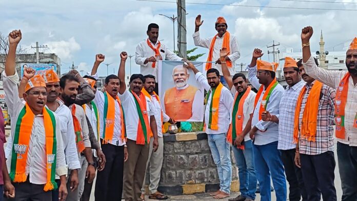 Mortad, September 06 (Gatla News): At the Mortad Mandal Center, as per the call of the BJP party, under the direction of Balkonda Constituency In-charge Dr. Eleti Mallikarjun Reddy, a portrait of Prime Minister Narendra Modi was anointed with milk on Saturday under the auspices of Mortad Mandal President Shivanand Reddy. Speaking on the occasion, Mandal President Shivanand Reddy said that the Center has reduced the GST for the welfare of the poor and middle class people. He said that this reduction will be very beneficial for the poor and middle class people, starting from the daily necessities used by every family, starting from notebooks for students and ending with the automobile sector for farmers. Along with this, he said that all the people are celebrating with joy and enthusiasm with the sensational decision taken by the Central Government to reduce the GST on the insurance sector and impose zero GST on 33 types of medicines needed by the people in terms of health. He asked the people to support the Bharatiya Janata Party, which wants the welfare of the people in the future. District Secretary Sangam Anil, Mandal General Secretary Alisetty Srikanth, former Mandal President Puppala Naresh, Vice Presidents Santosh, Bobide Mohan, Bhavala Narsayya, Chinna Reddy, Ashok, Gangareddy, Kisan Morcha District Member Yeleti Sayanna, Shakti Kendra Incharge Lakshmi Narsayya, Mandal Kisan Morcha President Gangareddy, Mandal ST Morcha Presidents Prakash, Sampath, Savin, Praveen, Navin, Sagar, Shekhar, Narsayya, Balaraj, Narayana and others participated in this program.